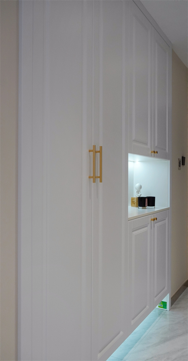 入戶玄關(guān)定制嵌入式到頂收納柜,空間利用到了極致,白色的柜體與整體完美結(jié)合,簡潔又美觀實用。中部鏤空設(shè)計,便于進出門擺放隨手物品,也可添置家居飾品。柜體內(nèi)嵌燈帶,為一進門的屋主帶來了更加溫馨的氛圍。