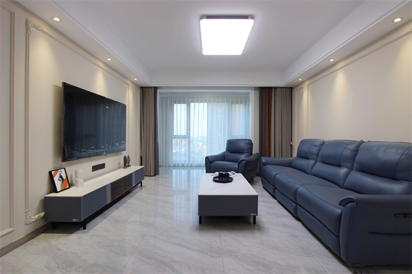藍色皮質(zhì)沙發(fā)儼然成為整個客廳一筆明亮的色彩,在視覺上給人沖擊的審美效果。沙發(fā)背景墻采用石膏線搭配角花勾勒造型,豐富空間層次。電視背景墻同樣利用石膏線設(shè)計出了簡潔的造型裝飾活躍空間氛圍,避免過于單調(diào),搭配藍色電視柜,精致美觀。
