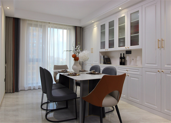 將北陽臺納入餐廳,形成開放式空間,超大落地窗大面積引入光線,瞬間擁有開闊、明亮的就餐環(huán)境,一秒get通暢大氣感。整排餐邊柜以強大的收納和超高顏值取勝,其中采用長虹玻璃做柜門,這樣朦朧感就有了,也不會顯得視覺凌亂,中部鏤空設(shè)計可放咖啡機、杯子、書本等。