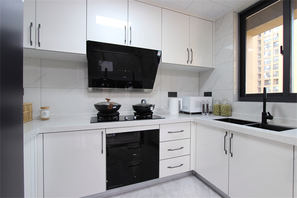 廚房與餐廳之間采用長虹玻璃做隔斷,整體通透明亮,不影響采光的同時又能阻隔油煙。利用率最高的U型廚房布局,合理規(guī)劃烹飪區(qū)、操作區(qū)、清洗區(qū),讓下廚方便很多。白色櫥柜打造空間明亮感。