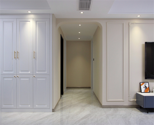 通往臥室的走廊區(qū)域,連接起生活區(qū)與休息區(qū),由弧形門洞作為過渡,滿滿設(shè)計感,過道中間布滿筒燈提供照明。