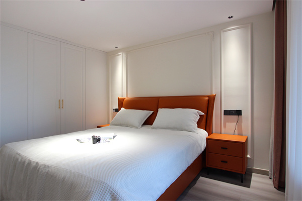 采用無主燈設(shè)計,利用筒燈、射燈來烘托空間氛圍。讓人一進屋就感覺很溫暖,好想泡個澡后,踏踏實實的睡上一覺。愛馬仕橙與米白彼此呼應(yīng),動靜相襯,展現(xiàn)空間秩序感,帶來獨特的視覺感受。