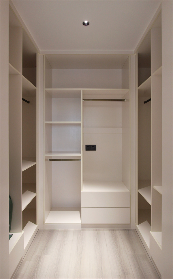 為了滿足主臥擁有衣帽間的需求,打造步入式衣帽間,既保護了屋主隱私,也滿足了主臥的衣物儲物。推開門進入衣帽間,上半部分是掛衣區(qū),中間是疊放區(qū),下面還設(shè)計了收納小件衣物的抽屜格。