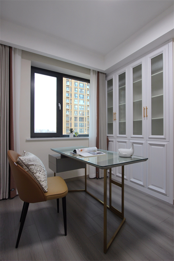 主臥做大套間設(shè)計,休息區(qū)外就是書房空間,定制組合書桌收納柜,可以滿足工作、寫字、學(xué)習(xí)的需求。嵌入式書柜設(shè)計,為書房騰出更多實用空間。柜門選用長虹玻璃,美觀實用。書柜結(jié)構(gòu)豐富,儲物、藏書、展示都能滿足。