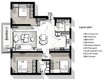黑色皮革沙發和深色窗簾相互呼應,簡約時尚的單品搭配,在淺色木紋地板和白色漆面的空間里顯得新穎又大氣。客廳電視背景墻與女兒房臥室門結合為隱形門形式展現,整體性非常強,按塊面分割白色飾面板很好的隱藏了門的存在感。