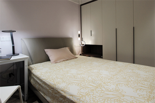 次臥在雅灰的基礎上,增加了大量的木色,燈光的點綴也讓空間更顯溫馨舒適。轉角書桌+衣柜組合,充分利用每一寸空間。