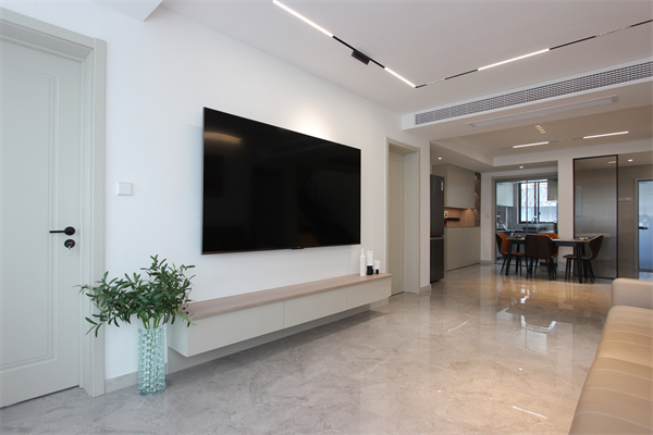 一字型懸空式電視柜,使用方便,滿足日常存儲(chǔ)。柜體選用20cm厚度,既不顯得笨重又能避免衛(wèi)生死角。寬大的灰色皮質(zhì)沙發(fā)質(zhì)感滿滿,亮色抱枕點(diǎn)綴其中豐富了空間層次感。白墻搭配組合裝飾畫,提升整體家居格調(diào)。
