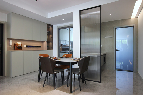 餐廳采用灰白經(jīng)典配色,演繹出“低調(diào)奢華”的氛圍感受,讓整個(gè)空間感覺更充實(shí)飽滿。深灰色的桌椅與整體的裝修風(fēng)格一致,加以橙色點(diǎn)綴,靈動(dòng)而活潑。