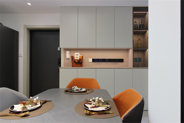 靠墻設(shè)計(jì)收納柜,既可做玄關(guān)柜也可做餐邊柜,立頂?shù)墓褡蛹瓤梢栽黾觾?chǔ)物空間,又避免了頂面易積灰的問題。餐邊柜功能齊全,局部鏤空可放置鑰匙、裝飾物等,另外安裝可移動(dòng)軌道插座,省去開墻煩惱,美觀又方便。