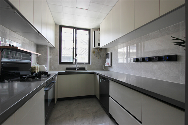 U型廚房設(shè)計(jì),洗滌區(qū)、烹飪區(qū)及操作臺(tái)等空間劃分極其明確,操作動(dòng)線無縫銜接。同樣設(shè)計(jì)可移動(dòng)軌道插座,功能配置充足,滿足多個(gè)家電同時(shí)使用。廚房設(shè)置玻璃推拉門,做飯時(shí)關(guān)上就能有效隔絕油煙,還不影響廚房采光。