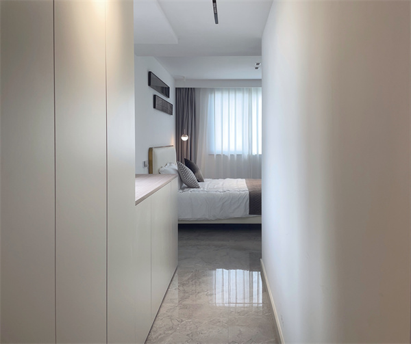 最巧妙的設(shè)計(jì)是主臥與主衛(wèi)過道空間充分利用,兩邊設(shè)計(jì)內(nèi)嵌式衣柜,將原本臥室的過渡空間布置成“衣帽間”,不僅裝飾了過道,還帶來了大量的儲(chǔ)物空間。