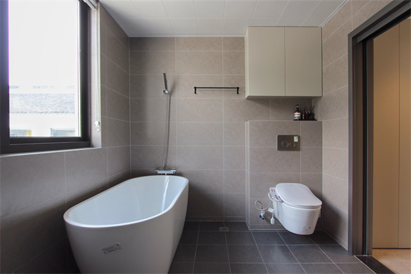 灰色系主衛(wèi)設(shè)計(jì),高級(jí)又耐看。鏡柜將鏡子和收納合二為一,護(hù)膚品和化妝品都能整齊放置其中,保持臺(tái)面清清爽爽,減少雜亂。內(nèi)部空間經(jīng)過設(shè)計(jì)和精確的尺寸推敲,為屋主二人放下一個(gè)深泡浴缸。壁掛馬桶水箱入墻安裝,隔絕沖水噪音,還節(jié)省浴室空間。吊柜和馬桶之間還留空做了置物臺(tái),可放置紙巾、手機(jī)、香薰等物品。