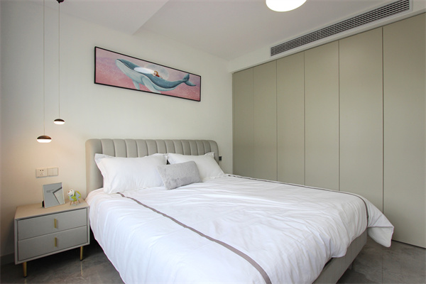 次臥設(shè)計(jì)比較女性化一點(diǎn),弧形的灰色造型床頭,時(shí)尚感十足。粉色鯨魚裝飾掛畫,少女心滿滿。定制一整面墻的衣柜,保證了儲(chǔ)物空間,也滿足了次臥的收納需求。