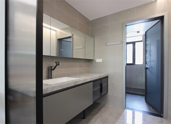 客衛(wèi)做了干區(qū)外置,用長虹玻璃做了半墻隔斷,避免尷尬的同時(shí)也不會(huì)影響通透采光。臺(tái)盆下方抽屜大空間的設(shè)計(jì),有效收納衛(wèi)浴間不常用物品,加之右側(cè)長虹玻璃設(shè)計(jì)的柜門,收納功能強(qiáng)大,視覺上更整潔、更美觀。內(nèi)部安裝折疊隔斷簾,打造隱形簡潔浴室。墻面多處采用壁龕設(shè)計(jì),不占用沐浴區(qū)空間,放沐浴用品等都非常方便。
