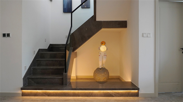 樓梯采用大理石臺(tái)階,十分美觀大氣。臺(tái)階下的燈帶,在解決照明問題的同時(shí),讓樓梯更加有造型感與藝術(shù)感。樓梯間的燈光處理也是本案的一大亮點(diǎn),光線籠罩宇航員擺件,讓人不自覺便將目光轉(zhuǎn)到這一重點(diǎn)上,又給空間增添了幾分時(shí)尚的感覺。