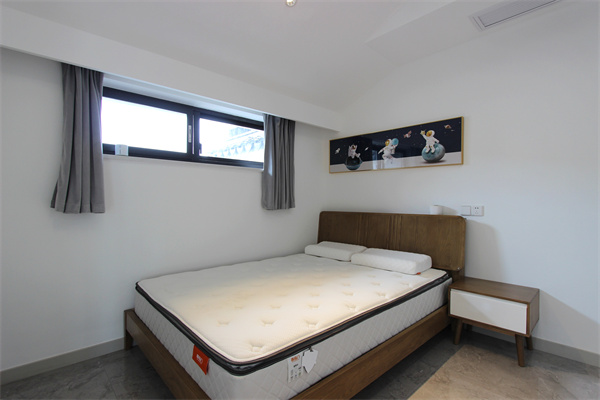 主臥選用低飽和度的色調(diào),打造適合睡眠的簡約氛圍。白色床品簡約又不失優(yōu)雅,給人一種絕佳的治愈感。門后白墻安裝一面鏡子,既方便了屋主出門前整理儀容,又能起到提升視覺空間感的作用。