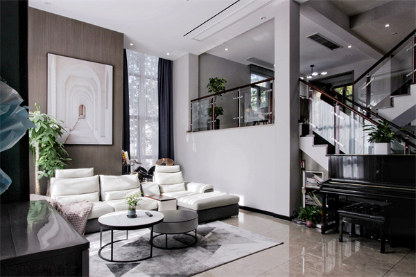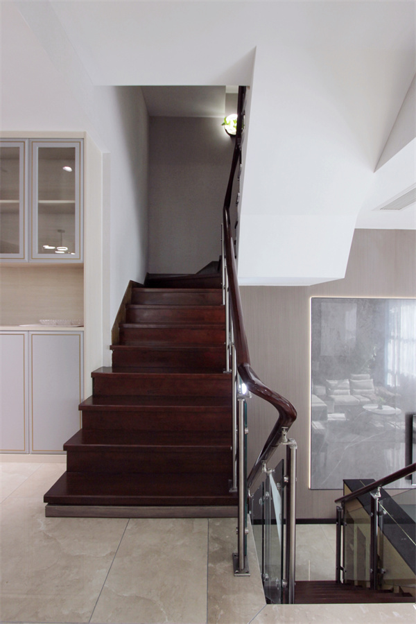 樓梯一角獨(dú)獨(dú)放著一盆百合竹,像是被上帝親吻過一般,似乎有一種蜿蜒向上的韌勁。樓梯選用紅木質(zhì)地,木料與身俱來的溫暖,集安全、舒適、美觀于一體。樓梯下方做收納格充分利用空間,鋼琴放置于樓梯一旁,豐富整個(gè)空間。