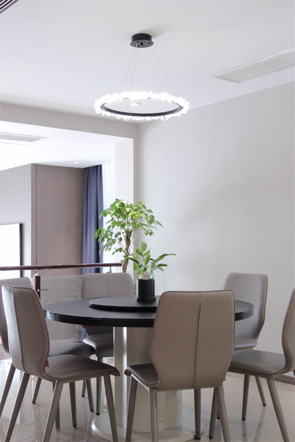 餐桌采用傳統(tǒng)圓桌,為了避免浮華,以簡(jiǎn)潔黑白灰調(diào)為主,一家人圍坐用餐,其樂融融。餐廳后方設(shè)計(jì)水吧臺(tái),亦能作為西廚操作臺(tái),餐邊柜放置各種餐具,內(nèi)嵌烤箱、蒸箱,使得空間功能最大化。