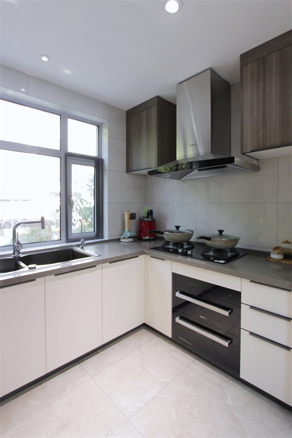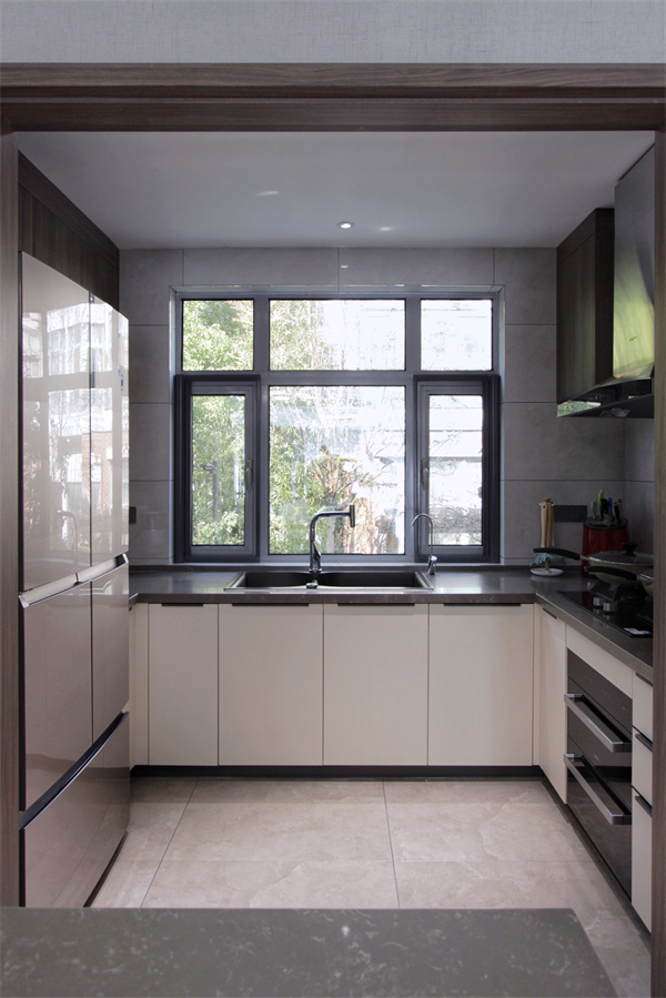 西廚吧臺(tái)后便是中廚,半開放的結(jié)構(gòu),讓日常下廚操作時(shí)更加便捷。雙開門冰箱完美嵌入柜體之中,廚房少了對(duì)外的隔斷,僅用吧臺(tái)隔開空間,既獨(dú)立,又具有空間包容性。