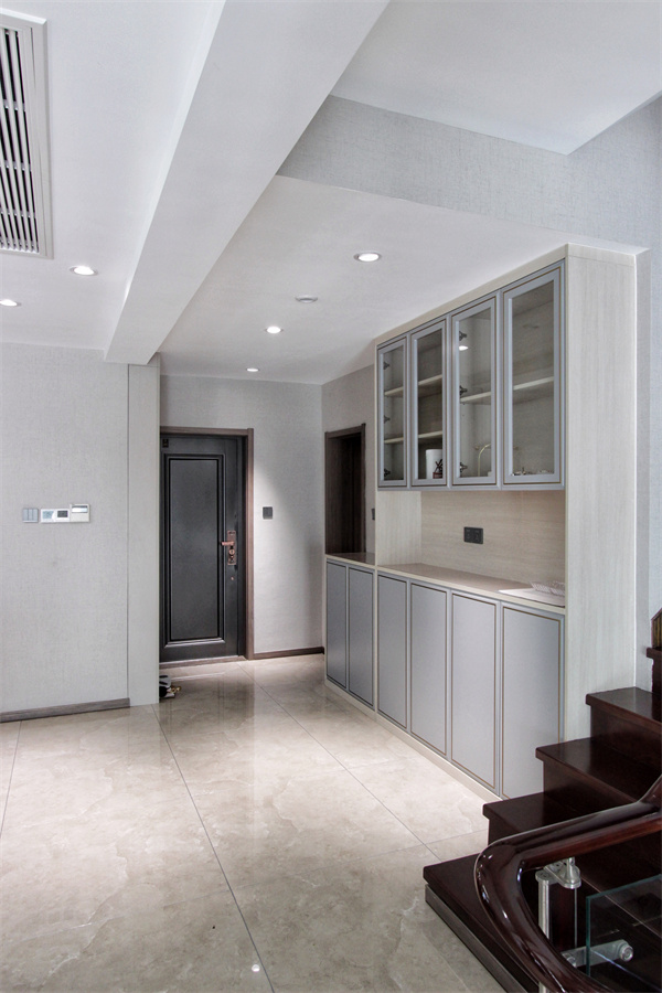 玄關(guān)空間視覺功能弱化,盡可能將一切“藏”起來,玄關(guān)柜上的時(shí)鐘讓主人更有時(shí)間觀念。筒燈設(shè)計(jì)更著重將光源分散,與大理石地面交匯呼應(yīng),意在打造更有意境的入戶氛圍。玄關(guān)柜亦可作為餐邊柜使用,透明柜門用于展示好看的餐具,再連接樓梯做結(jié)尾。