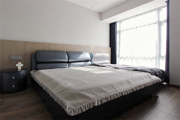 主臥簡(jiǎn)約,以黑色咖色為主調(diào),床頭背景以木飾面半高護(hù)墻板修飾,與白墻形成簡(jiǎn)潔的對(duì)比感。床頭柜造型獨(dú)特,床頭淺色木飾面與地板色調(diào)相得益彰,整體低飽和的色調(diào),突顯優(yōu)雅。烤漆柜門使臥室空間更為清雅,舒適的溫暖木料質(zhì)地充滿整個(gè)屋子,帶來更多的寧?kù)o。
