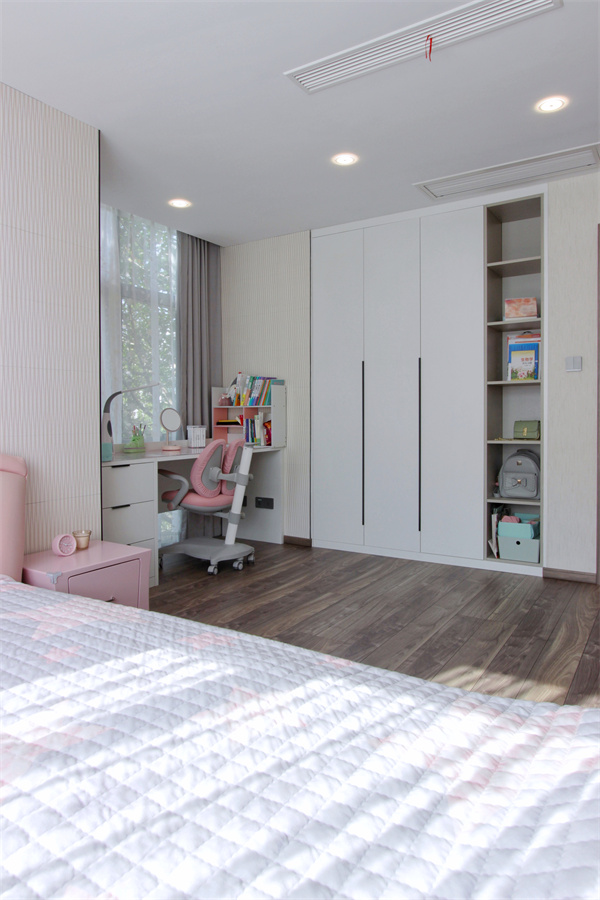 大女兒的房間閑適、靜謐,獨(dú)立的個(gè)人空間,采用無主燈設(shè)計(jì),床頭筒燈靠近邊緣,有效護(hù)眼。空間構(gòu)成追求的是空間的實(shí)用性和靈活性,將不同功能相互滲透、融合。床頭護(hù)墻板采用日本大建礦棉板,防火防潮,還能吸收甲醛,安全性能爆棚,隔音效果極好,給孩子自在的學(xué)習(xí)、休息環(huán)境。