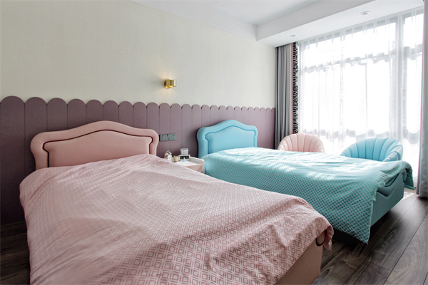 兒童房是孩子們對(duì)空間、色彩、形狀產(chǎn)生最初認(rèn)知的地方,兩個(gè)寶寶住在一起,便于他們學(xué)會(huì)溝通交流。和姐姐的房間一樣,衣柜同樣采用收納格的設(shè)計(jì),兩個(gè)床一藍(lán)一粉,是孩子們的自主選擇。紫色柵欄形狀的護(hù)墻板為房間增添童趣,床頭柜抽屜按顏色區(qū)分,讓兩個(gè)孩子擁有自己的隱私。