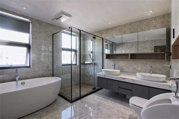 二樓的私人衛(wèi)生間擁有超大面積,橢圓形浴缸完美的將身體包圍,疲憊的時(shí)候,泡個(gè)澡仿佛就能重獲新生。灰色大理石紋墻地磚讓空間更加整體,鏡柜組合底部留空,收納與拿取更加便捷。墻面嵌入式收納柜搭配燈帶使用,簡(jiǎn)單而不繁復(fù)的設(shè)計(jì),讓衛(wèi)浴空間更加舒適。