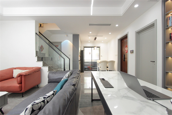 客廳整體以現代簡約風格的設計,簡潔大方的空間,明亮的采光在整個空間里,呈現出一種舒適輕松的居住氛圍。書房與客廳實行一體化設計,中間沒有多余的空間隔斷劃分,讓空間看起來更加的通透,也讓人與人之間的距離更加緊密。