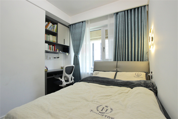 在整個空間里,通過不同質感的材質運用與搭配將現代風打造得淋漓盡致,讓休閑成為這個空間的一大亮點。次臥空間采用吊柜+書桌傳統組合設計,使得空間具有功能性,靠窗布局,帶來舒適明亮光線。床對面做了通頂衣柜,一側中部留空作為展示,既美觀又超省空間。