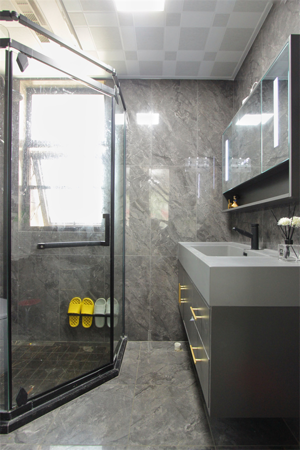 整體空間鋪貼大理石瓷磚,設計簡約而不簡單,打造大氣空間感,一體化的臺盆搭配大面積的鏡柜,鏡柜下部鏤空,洗漱收納更加方便。衛生間打造干濕分離,用玻璃門隔斷,在浴室一側墻上打造壁龕,用來放沐浴用品,方便拿取。