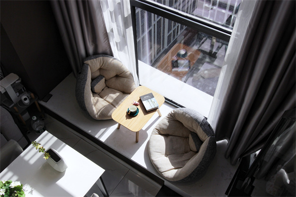 電視背景墻以大理石上墻,兩側護墻板內做燈帶設計,夜幕降臨,浪漫溫馨。后方的飄窗臺,放上軟墊與小木桌,作為休閑區,隨手翻看一本書,再倒上一杯自制奶茶,愜意美好。