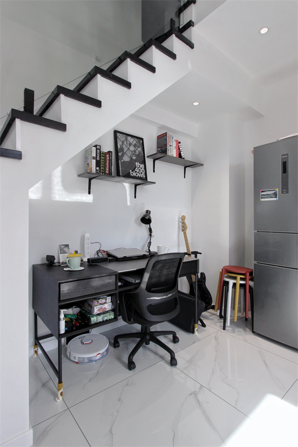 作為二人世界的小屋,男主人的辦公區域也必不可少,設計師在樓梯下辟出一塊用于辦公的區域,是一個互通而又互不打擾的小空間。