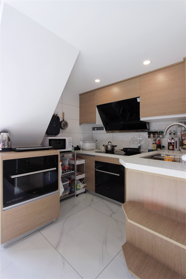 半開放的廚房位于娛樂平臺的樓梯下,麻雀雖小五臟俱全,舍棄繁復的燈具設計,利用筒燈照明,小小空間,充滿煙火氣。