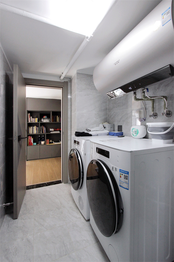 從飄窗臺一側的樓梯上去,是位于一層半的娛樂空間,里面擺放著業主精心收藏的精致手辦與書籍。過好日子必然少不了洗衣晾衣,陽臺是用來休閑的,那么洗衣房一定必不可少了,滿足了洗衣烘干功能的洗衣房,再也不用擔心衣服亂糟糟的晾曬而影響美觀了。