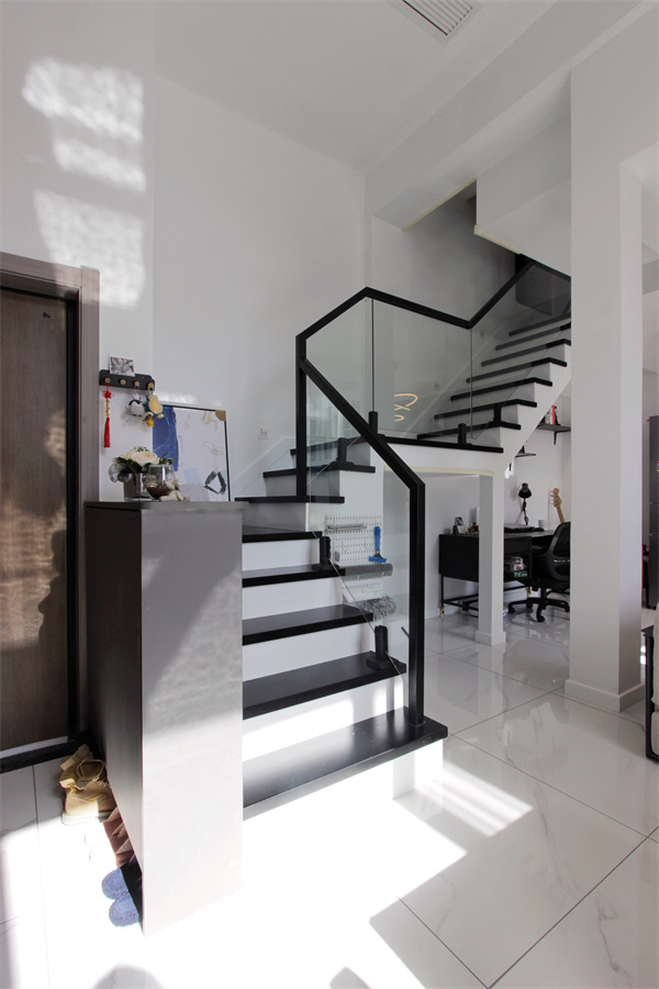 半高玄關柜收納常用的鞋子,也為樓梯做了隔斷作用,讓樓梯與玄關成為一個整體。黑白相間的樓梯,品質感滿滿,隔幾步,嵌入墻內的小夜燈就會亮起,更具安全性。