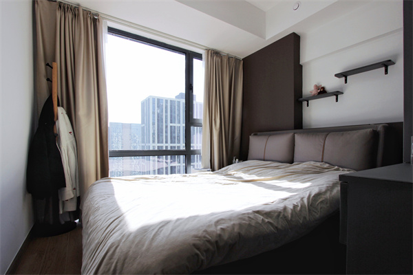 三樓為主臥空間,整面落地大窗,讓每一個醒來的早晨都充滿活力。褐色為主調的私人空間充滿時尚感,茶色透明柜門內收納僅僅有條,床頭擱板擺放飾品,更加溫馨。