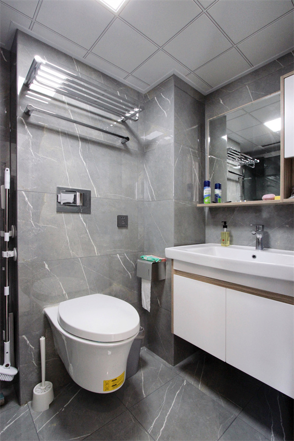 一樓衛生間為客衛,嵌入式水箱節約空間成本,設計師利用空間特質分配功能區域。