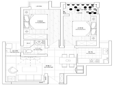 客廳與餐廳空間由玄關隔斷自然分開,餐廳緊靠廚房,寬敞的過道,使空間動線更順暢。以淡雅清爽的自然材質為主,幾何造型吊燈突出個性與精致,生活情調盡顯于此。