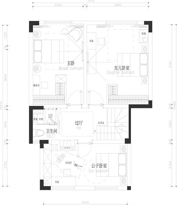 書桌組合柜置于床尾,為女孩的獨立的學習區,也使女兒房每個區域功能明確。