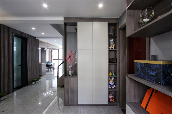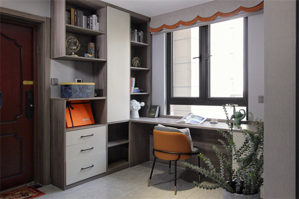 入戶原為門廳的區域改為開放式書房,很好的將功能融合。開放式的入戶空間,使空間看起來更加寬敞,玄關柜擁有隔斷作用,使開放式書房更像是一個獨立的空間。