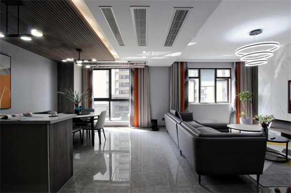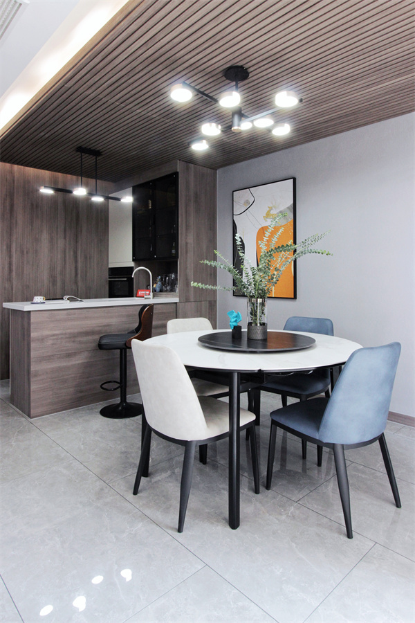 客餐廳一體,增加了空間交流,入戶景觀區的格柵墻面與餐廳區域相連,使整體看起來更為統一。