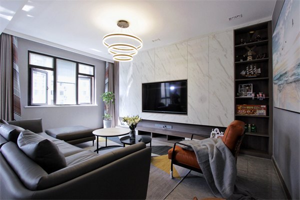 電視背景墻采用整面收納柜,擁有強大的收納功能,中間嵌入電視機位,免拉手的設計使其更加美觀。電視背景墻一側做開放格,增加展示位,灰色沙發的低調色彩,將空間平衡。大理石紋路電視柜作為客廳C位,更多的體現了業主的審美與品位,與深色木飾面一起打造沉穩空間。