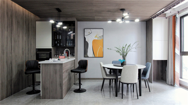 餐廳與走廊統一采用格柵木飾面,低調色彩,樸素自然,整體為橫廳構造。設計師將生活陽臺拆除,增加西廚島臺,將空間充分利用,同時擁有島臺、餐廳與陽臺三大區域。