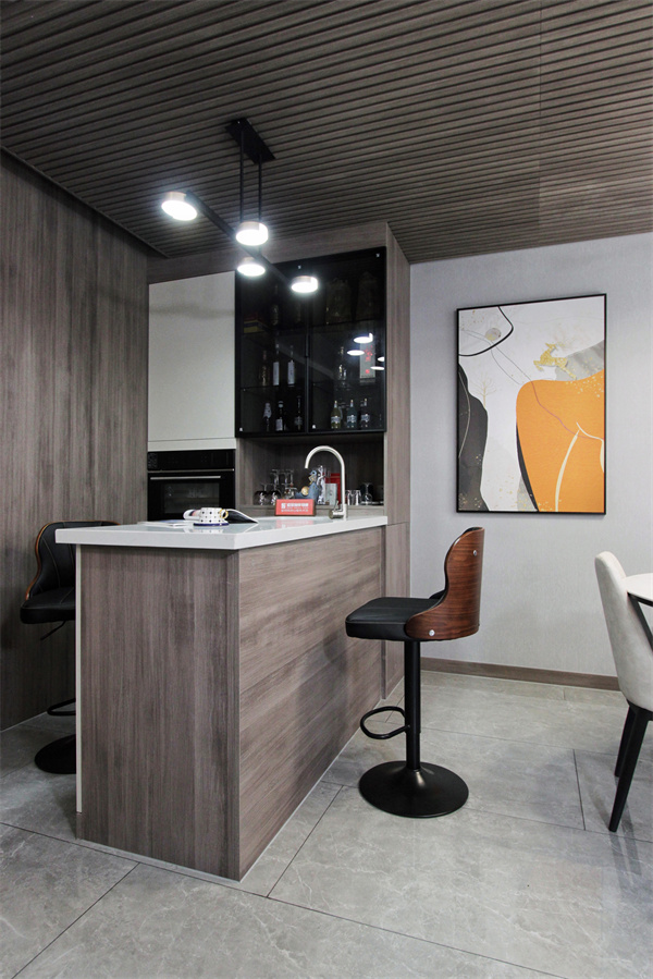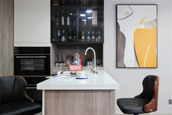 整個客餐廳區域,島臺的利用率可以說得上是最高的,內置水池臺盆,柜體內嵌烤箱,簡餐、沙拉都可以在這里輕易完成,加上兩只吧臺凳,休閑實用兩不誤。