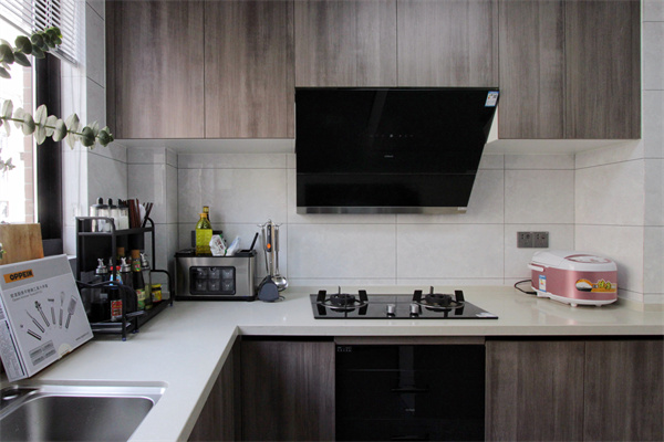 廚房空間在原來的基礎上,擴充了內部空間,格局為向內延伸的L形,黑白灰的色調簡約又整潔。