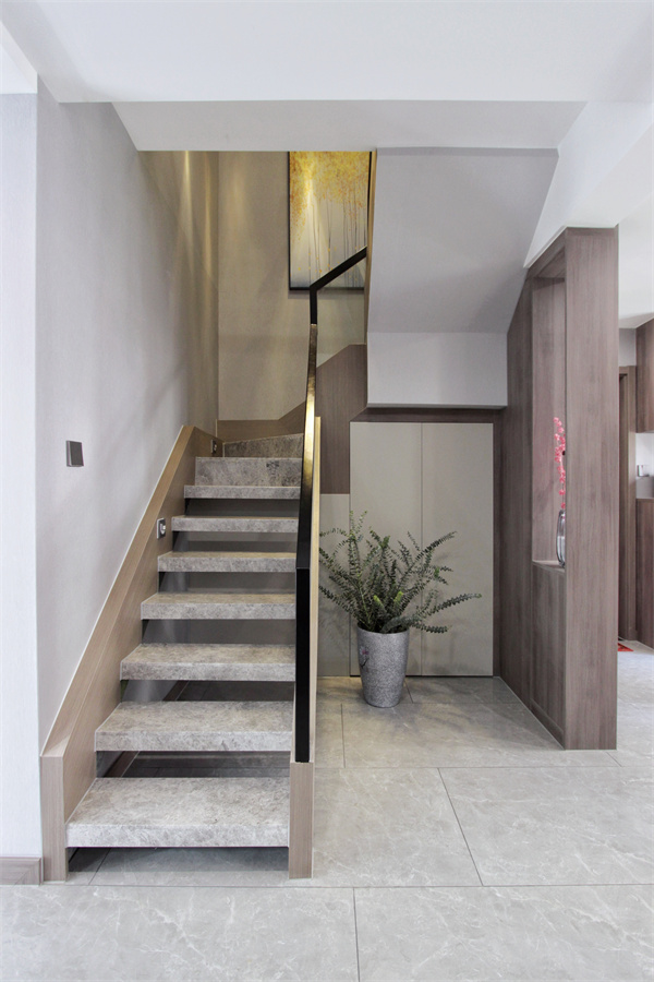 樓梯采用與玄關呼應的黑色啞光扶手與木飾貼面,階梯采用阿瑪尼灰的大理石紋理,與地面灰色呼應。梯下區域做景觀區的同時,也擁有巨大的收納空間,作為隱藏式儲藏室十分實用。樓梯的木飾貼面與二樓地板呼應,無論是一樓或是二樓的空間,都顯得十分統一。