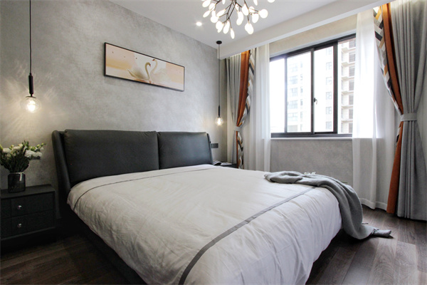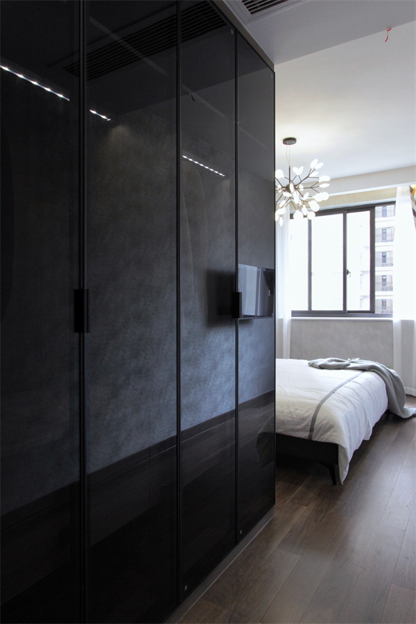 主臥以冷峻的黑灰色調為主,再利用溫暖的燈光進行中和,整體更加靜謐舒適。為了擴大主臥室內空間,設計師將陽臺拆除,為室內增加一體化衣帽區。