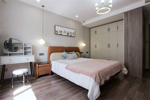 獨立衣帽區利用柜體隔斷,白色柜門與木紋柜體的雙色搭配,使空間不再單調。梳妝臺隱藏在入門衣柜后,既保證了隱私,又給女主人一個獨立的梳妝區域。入門衣柜為透明玻璃質地,柜內設置燈帶,放置業主的外套等衣物,衣柜的設計同時也保證了主臥的私密性。