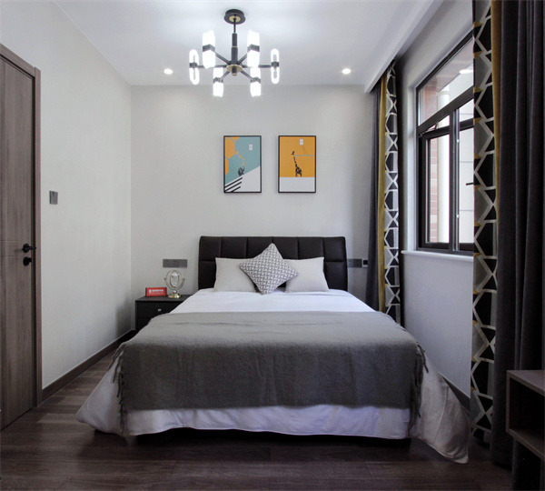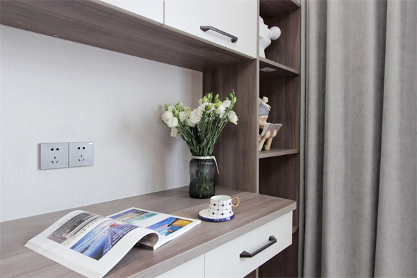 男孩房黑白灰為主的中性色調,更符合男孩子未來的審美趨勢。因為男孩房是由兩個房間打通組合而成,所以橫向面比較長,一側為休息區,一側為學習區。為日常學習量身定制的書桌高度,符合人體工程學,整體原木定制更有品質。